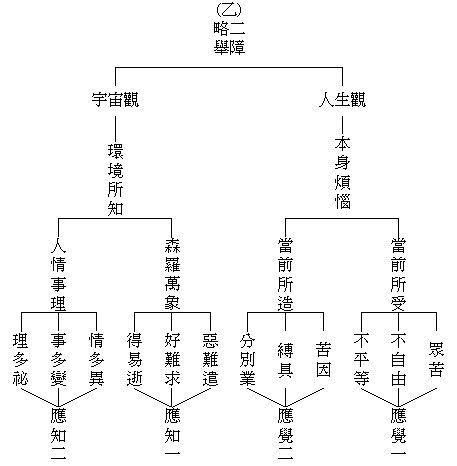 ‘宇宙观’,对环境的觉悟。‘环境所知’:这是讲所知障,前面是烦恼障;所知障是对环境说的。环境,我们一般叫宇宙观;观就是觉悟,宇指空间,宙指时间,整个时空里面所包括的一切现象。分为两大类:‘森罗万象’是讲物质环境;‘人情事理’是讲人事环境。