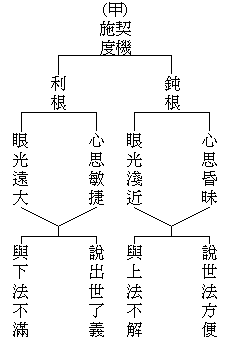 ‘利根’的人‘心思敏捷’,见闻觉知很利,一看他就明了,一听他就懂得,一闻千悟。他的‘眼光远大’,不仅仅是谈眼前的事情,他晓得有将来、有来世,他要求更殊胜的果报,要求究竟圆满的果报。佛遇到这一类的人,‘说出世了义’,满足他。‘与下法不满’:他不求人天福报,他要求究竟圆满的解脱。