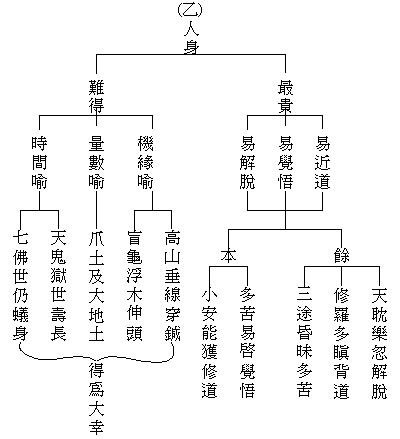 ‘难得’:人身难得。为什么难得?底下是佛在经上所说的比喻。‘机缘喻’:机缘不容易。第一个比喻,‘高山垂线穿针’:佛是讲须弥穿针,须弥山是最高的山,从山上垂一条线下来,山下放一个绣花针,线一掉下来刚好就穿进针孔。你们想想,这个机会有几成?这是说得人身的机会这样渺茫,我们是须弥山那条线,恰巧就穿进人道这个针孔,真不容易。第二个比喻,‘盲龟浮木伸头’:瞎眼的乌龟在大海里,大海里有个木板,木板当中有个洞,木板在大海里漂,瞎眼的乌龟头一伸出来,刚好伸在木板洞里;这个机会太难得,机缘不容易。佛说的话是圣言量,我们要相信,佛不会欺骗我们的。《金刚经》说:‘如来是真语者、实语者、如语者、不妄语者、不诳语者。’我们一定要相信佛所说的,人身不容易得来。在六道里,神识投到人道确实不容易。
