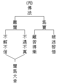 这一段讲佛法难闻。闻到佛法是机缘,这个机缘非常难得。今天全世界四十多亿人口,有几个人在一生当中听到佛法?很难!台北市二百多万人口,几个人闻到佛法?闻佛法的机缘实在不容易。‘佛法为宝’:佛法有什么好处?佛法是宝。宝的意思是有用,我们人要是得了财宝,物质生活就不缺乏,可以过很富裕舒适的生活,取这个意思。佛法能帮你‘破迷启悟、离苦得乐’:离的是三界轮回之苦,得的是究竟之乐;这是我们人生所向往的,所追求而追求不到的,佛法里头有。‘不遇不真’:佛法不容易遇到。我们现在遇到了吗?未必。遇到的也许是假佛法,不是真佛法。遇到不是真的佛法,跟没遇到没有两样,不能成就,你跟他学,迷上加迷,苦上加苦,不能解决问题。‘不解不信’:遇到真正的佛法不解,《大藏经》看不懂,那也得不到利益。看懂了,又未必相信。有很多大学教授、天主教神父,买《大藏经》在家里看,研究参考,但他不相信;不信,也是枉然!能信,信了之后又不愿意修行,那也不行。信了之后要发愿,有愿,又不肯行;或者肯行,行了又不努力,进进退退。这样一层一层的淘汰,剩下来没几个人;台湾这么多人学佛,淘汰下来,剩一百个都不到,岂不是佛法难闻?‘闻为大幸’:闻了之后,确实是真的,又能理解、又相信、又发愿、又努力的依教奉行,没几个人。这是真正要觉悟的,机缘实在不容易,开经偈说‘百千万劫难遭遇’,不止百千万劫。好不容易得到人身,又遇到正法的机会,这一生不能成就的话,怎么能对得起自己?甚至对不起佛菩萨,对不起父母师长,对不起一切众生。
