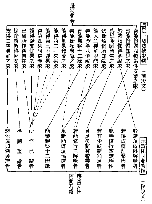 此中所出之功德,虽比前住阿兰若相后段文中稍多,但不过开合之不同耳。如此中于三解脱之后又加以八解脱一条,虽名相不同,然皆是修无所得之空观法。所谓八解脱者:一、内有色想观外色解脱,二、内无色想观外色解脱,三、净解脱身作证具足住,四、空无边处解脱,五、识无边处解脱,六、无所有处解脱,七、非想非非想处解脱,八、灭受想定解脱身作证具足住。此略与八胜处、十遍处相同,为上二界与三乘所共修之法。其善能断除业障功德,略与阿兰若相中之‘永断能缚烦恼结’相同,不过明阿兰若功德中,就其烦恼所感得之业果而言耳。此明阿兰若功德中,多出声闻四果与辟支佛果,即阿兰若相中之‘所作已办’摄之。其阿罗汉果与辟支佛果,正是所作已办之人;其声闻之前三果,虽不即是所作已办者,但阿罗汉果是基于此三果者,故亦摄之于所作已办中。此明阿兰若功德中又举出所作已办者,总明二乘人之得自在,亦无妨碍。前阿兰若相中有‘若得成熟涅槃因者一一条,虽未摄于此何种功德中,但此一条可说是总明修菩提道法者,则可通摄一切。要之、此表中用实线者,即是上下相同;其用虚线者,则可摄于某种中。