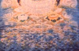 末学每诵念无量寿经到礼佛现光的那一段时,就感染当时与会大众那不可言喻的欢喜踊跃,眼前呈现出一幕影像,依那欢喜的一念画下了底稿。对一个不谙美术的人而言,尝试画此实在是可笑的历程,但也许有一天,会有一个人,长夜忧恼时,会因瞥见它而会心一笑,想起佛慈吧?