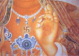 当末学行动不很灵光的时候,自己爬上爬下去画在上空的曼陀罗花,以及画佛陀的身光,家师慈悯,看了很担心末学的安全,就特请祥师慈悲的照顾末学,扶末学登高,在下面帮助末学传递颜料、叠箱子;还有把一块八尺长、四尺宽的厚木板,随须要立直或平放著……等等,这些辛苦的动作,都是由她来承担。整幅佛像,是由喷笔‘零点二公厘’的小孔里,把颜料喷出来而画成的。只要这小孔有一点阻塞,喷画就没有办法进行,所以将喷笔清洗得非常干净,是一件十分重要的工作,这也让末学体会到‘清净的心,是最重要的。’假如喷笔管不干净,就无法画佛。有一点堵塞就会爆喷!