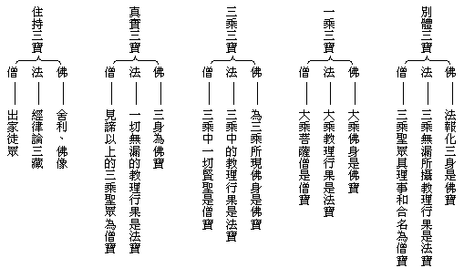 三宝的种类有六种:(一)同体,(二)别体,(三)一乘,(四)三乘,(五)真实,(六)住持。
