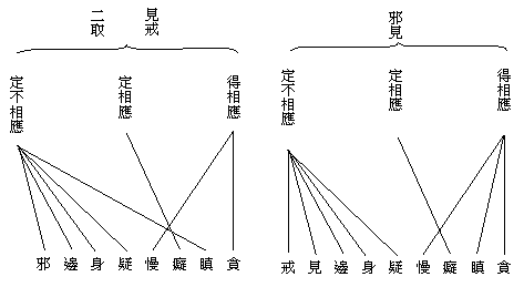 (三)无色界:无明支中,唯有胜义愚,有覆无记性。行支中,唯有不动行,唯有意业。识支,唯是化生天趣。名色支中,唯有名无有色。名中又无五识。六处支中,唯有意处。触支中,唯有俱相违触。受支中,唯有舍受。爱支中,唯有有覆无记性。取支中,概摄一切烦恼,在根本烦恼中,唯有九种,除去嗔心。随烦恼中,除小七(忿、恨、覆、恼、嫉、悭、害)中二(无惭、无愧)是不善性,唯欲界有故。诳、谄通欲界及初禅,憍及大八通三界。故随烦恼中,唯有憍及大八。有及生老死,准色界可知。