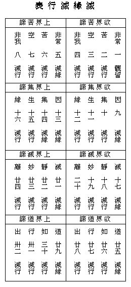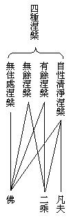 以上四种涅槃,是依著一实真如的显现义边的差别而安立前四种,实即一清净法界而已。第一种凡亦具有,二乘无学并得前三,唯佛世尊具有四种。立表如表四: