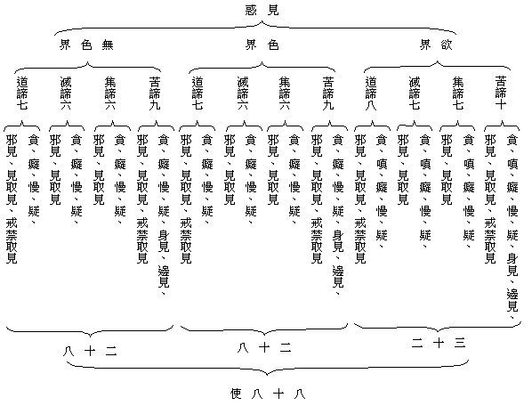 一、烦恼障:烦是扰义,恼是乱义,扰乱有情身心,不令出离生死苦海,故名烦恼。障是覆蔽义,即烦恼覆蔽涅槃不得解脱,是名为障,烦恼即障,故名烦恼障。其体即遍计所执实我萨迦耶见而为上首的一百二十八个根本烦恼,及彼根本烦恼同类所引起的等流诸随烦恼。一百二十八数是,见道所断惑有十种,即、贪、嗔、痴、慢、疑、身见、边见、邪见、见取见、戒禁取见,这十种烦恼,各障欲界苦集灭道四谛之理,故有四十。障色界四谛理的只有三十六个,因为色界无嗔烦恼,于每一谛下除去嗔惑,故成三十六。障无色界四谛理的烦恼,与色界相同。总合起来,障三界四谛理的烦恼共有一百一十二个。更加上修道所断惑十六种,即成为一百二十八数。十六惑是:欲界六个,上二界各五个。贪、嗔、痴、慢、身见、边见,是欲六惑,上二界无嗔,各有五惑,故三界修道所断惑合有十六个。等流随惑,即二十种。此上所说,唯是自性出体,若据眷属,即同时相应的诸余心心所及五蕴,亦皆是烦恼障摄。