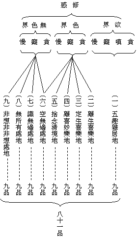 三、伏断位次:灭现行名伏,除种子及习气名断。断的意义,约能断说,是除害义;约所断说,是不续义;自类相生的种子后生的作用不相续,即是断惑。过去未来的法无体,故无所断;现在惑智俱起,亦无所断;但由教行因缘引起正见相应的能治心,此心生时,所治惑种即灭,智生惑灭同一刹那,犹如世间明生暗灭,断惑义成。烦恼所知的分别二障,资粮位渐伏,加行位顿伏。少分伏名渐伏,犹有余故;全分伏名顿伏,更无余故。资粮位伏其粗者,由胜解力折伏;加行位伏其细者,由四寻思四如实观制伏。因邪师邪教所引起的名粗,由自分别所引起的细。分别二障的种子与习气,俱初地断;即于真见道位中的无间道断除种子,解脱道断除习气。