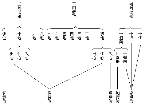菩萨行位,就因果合说,总有四十一位。即十住、十行、十迥向、十地、佛果。若开十住中第一发心住所修信等十心为十信,于第十地终别开顿觉,则总为五十二位。但十信是十住中发心住所修,等觉是法云地摄,故不别开。今且依慈恩大师立四十一位。此四十一位,又束为五位:一、资粮位,即地前住行向之三十心位:二、加行位,即修暖顶忍世第一法的四善根位;三、通达位,即初地入心(地地各有入住出三心)通达二空无我理的见道位;四、修习位,即自初地住心至第十地出心(即等觉)中间,修习妙观以断除余障的修道位;五、究竟位,即究竟断惑证理的无学位。前四位是因,后一位是果。资粮加行二位,是初阿僧祇劫:从通达位至七地终,是第二阿僧祗劫:从第八地至第十地满,是第三阿僧祗劫。时经三劫,行备四位,方证究竟的菩提大果。立表如表一:
