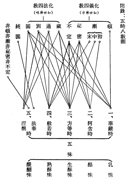 五、法华、涅槃时:法华为开权显实,涅槃是收拾残机,譬如日轮普照大地,时当正午,罄无侧影。法华于化仪超出四教——非顿、非渐、非秘密、非不定——法华乃摄三乘归一乘,但须假修而成,故非顿;但说无上道,不历阶位,故非渐;示十方佛土唯有一乘之法,真实而说,故非秘密;举手低头皆成佛道,一切众生决定成佛,故非不定。非顿、非渐、非秘密、非不定,此为法华之玄妙处。于化法四教中独明圆教,无复兼带余教,是唯实无权,纯圆无粗之教相。约味如从熟酥成醍醐(当知法华所明之圆教,与以前之圆教不同,以前之圆教不过异于藏通别而已,今则统摄以前诸教,归于圆满究竟之一佛乘,故法华称为纯圆独妙之教相)。涅槃为追说四教、追泯四教,约时约味都与法华一样,故涅槃与法华同以无上醍酬为味。总之,华严属顿,是别教所摄;阿含属渐初,为藏教所摄;方等属渐中,为通教所摄;般若属渐末,为别教所摄;法华、涅槃超出顿渐,纯属圆教所摄。又顿教兼用别教,正用圆教;渐教统用藏通别三教,秘密、不定二教通于四教。