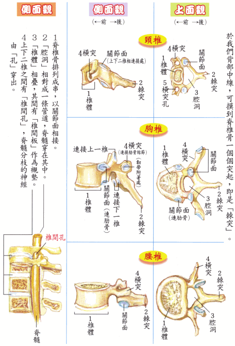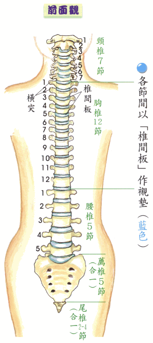 脊椎骨:本是一块块个别的骨头。是由5条主要的‘韧带’,将它们连接成串。周围又附有数十条肌肉。每块脊椎骨体中间又有一块富有弹性的‘椎间板’,充当衬垫。
