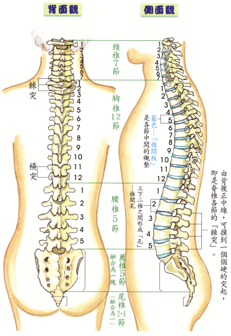 2、后面有‘棘突’(弯腰、垂头时背后中央可摸到一粒粒突出之骨,即是棘突)。