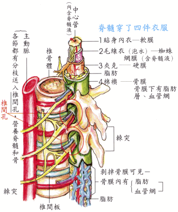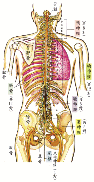 将脊椎骨之后部切除,以便观察贯穿在整串椎骨中的‘脊髓’,以及由各节脊髓分枝出来的‘神经’—左右成对,由‘椎间孔’穿出。分布到全身各部位(包括内脏和四肢)。注:肱音ㄍㄨㄥ