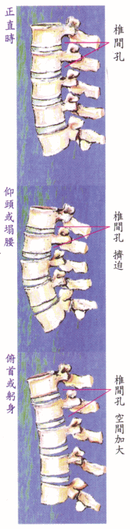 俯首: 则脊椎各节后边,如扇状展开,由上下二凹所合成的‘椎间孔’也较开,空间大—压力小,故通过其中的血管通畅,神经舒畅。 |
