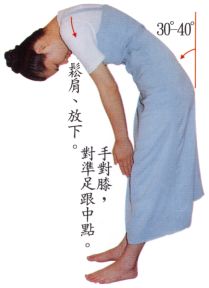 ·若不配合俯首,拉开颈椎及胸椎,舒活神经,则长期压迫,不只肩会酸痛,连手臂、手指亦会酸、麻、痛。若能俯首,拉开颈椎,则可改善。故此动作之要领,是要在垂头状态下,松肩。
