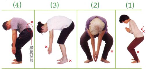 (4)也有人小腿虽直,重心放在足跟,却蹲不下去,无法弯腰。这是腰下部脊椎太僵紧,(腰荐关节)一时拉不开。(多练则慢慢开)