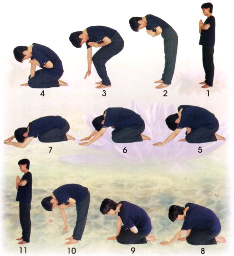 ☆注意:另有些道场,采用右手先按地于中,次而左手按地之法,(即两步半拜法)此亦有深义—因印度,以右代表‘正道’,故右手先按地,乃代表尊重正法,愿使众生得正觉道。