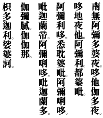 南无.喝啰怛那.哆啰夜耶.南无.阿唎耶.婆卢羯帝.烁钵啰耶.菩提萨埵婆耶.摩诃萨埵婆耶.摩诃迦卢尼迦耶.唵.萨皤啰罚曳.数怛那怛写.南无悉吉栗埵.伊蒙阿唎耶.婆卢吉帝.室佛啰愣驮婆.南无.那啰谨墀.醯利摩诃皤哆沙咩.萨婆阿他.豆输朋.阿逝孕.萨婆萨哆.那摩婆萨哆.那摩婆伽.摩罚特豆.怛侄他.唵.阿婆卢醯.卢迦帝.迦罗帝.夷醯唎.摩诃菩提萨埵.萨婆萨婆.摩啰摩啰.摩醯摩醯.唎驮孕.俱卢俱卢.羯蒙.度卢度卢.罚阇耶帝.摩诃罚阇耶帝.陀啰陀啰.地唎尼.室佛啰耶.遮啰遮啰.摩么.罚摩啰.穆帝隶.伊醯伊醯.室那室那.阿啰参.佛啰舍利.罚沙罚参.佛啰舍耶.呼嚧呼嚧摩啰.呼嚧呼嚧醯利.娑啰娑啰.悉唎悉唎.苏嚧苏嚧.菩提夜.菩提夜.菩驮夜.菩驮夜.弥帝唎夜.那啰谨墀.地利瑟尼那.波夜摩那.娑婆诃.悉陀夜.娑婆诃.摩诃悉陀夜.娑婆诃.悉陀喻艺.室皤啰耶.娑婆诃.那啰谨墀.娑婆诃.摩啰那啰.娑婆诃.悉啰僧.阿穆佉耶.娑婆诃.娑婆摩诃.阿悉陀夜.娑婆诃.者吉啰.阿悉陀夜.娑婆诃.波陀摩.羯悉陀夜.娑婆诃.那啰谨墀.皤伽啰耶.娑婆诃.摩婆利.胜羯啰夜.娑婆诃.南无喝啰怛那.哆啰夜耶.南无阿唎耶.婆嚧吉帝.烁皤啰夜.娑婆诃.唵.悉殿都.漫多啰.跋陀耶.娑婆诃。