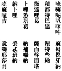 有人问心咒和随心咒有什么不同,该怎么念,也就是宝塔这一张(大宝广博楼阁善住秘密陀罗尼轮)。这张的功用很大,假如家里不平安,或让别人放符咒,坐乌贼(车船)或坐飞机都带这张,放在身上。临终时置于胸前,此宝塔能令一切恶业皆得消灭。心咒怎么念呢?就是唵摩尼[口*缚]日礼吽,随心咒是唵摩尼驮礼吽泮吒。梵文的这一张(毗卢遮那佛大灌顶光真言)是加持亡者,放在亡者身上,回去有空可以练习一下,要放对位置,家里不平安,也可以贴这一张,如果夫妻的房间不可以放。