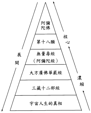 2、同理,一句‘阿弥陀佛’之展开,则为《阿弥陀经》、《无量寿经》与《三藏十二部等经典》,实无二无别也。故持一句‘阿弥陀佛’名号,无异受持佛所说一切经,如上图所示,正如莲池大师所言:‘一句弥陀,该罗八教,圆摄五宗’也。